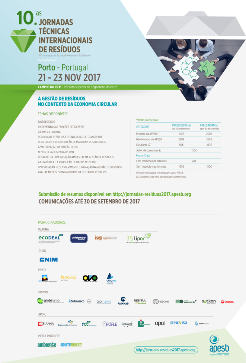 A 10.ª edição das Jornadas Técnicas Internacionais de Resíduos, da responsabilidade da APESB – Associação Portuguesa de Engenharia Sanitária e Ambiental, vai realizar-se no campus do ISEP, entre os dias 21 e 23 de novembro.