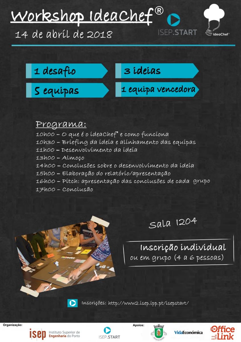 O ISEP.Start – Núcleo de Empreendedorismo do ISEP está a organizar, com o apoio da Junta de Freguesia de Paranhos, do grupo editorial Vida Económica e da OfficeLink, a 2.ª edição do Workshop IdeaChef, a decorrer no dia 14 de abril, entre as 10h00 e as 17h00, nas instalações do ISEP – Sala I204.