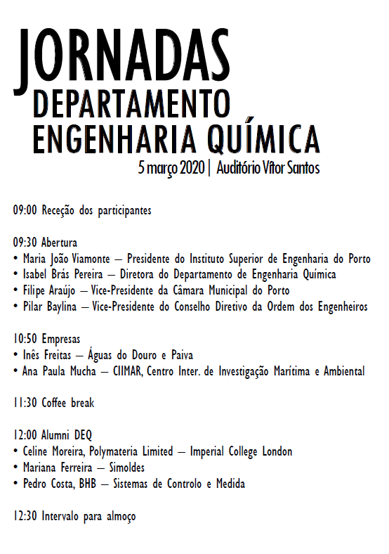 Organizado pelo Núcleo de Estudantes do Departamento de Engenharia Química em colaboração com a Direção do Departamento e os Diretores dos Cursos, este evento vai decorrer no dia 5 de março, a partir das 9h00, no auditório Vítor Santos (edifício E).