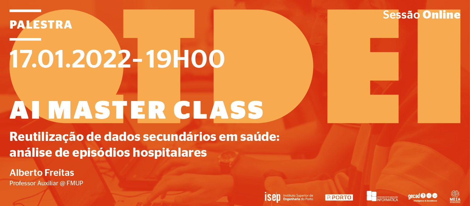 No dia 17 de janeiro (segunda-feira), às 19h, o DEI convida à participação em mais uma AI Master Class, desta vez sobre o tema “Reutilização de dados secundários em saúde - análise de episódios hospitalares”, com o Professor Doutor Alberto Freitas da FMUP.
