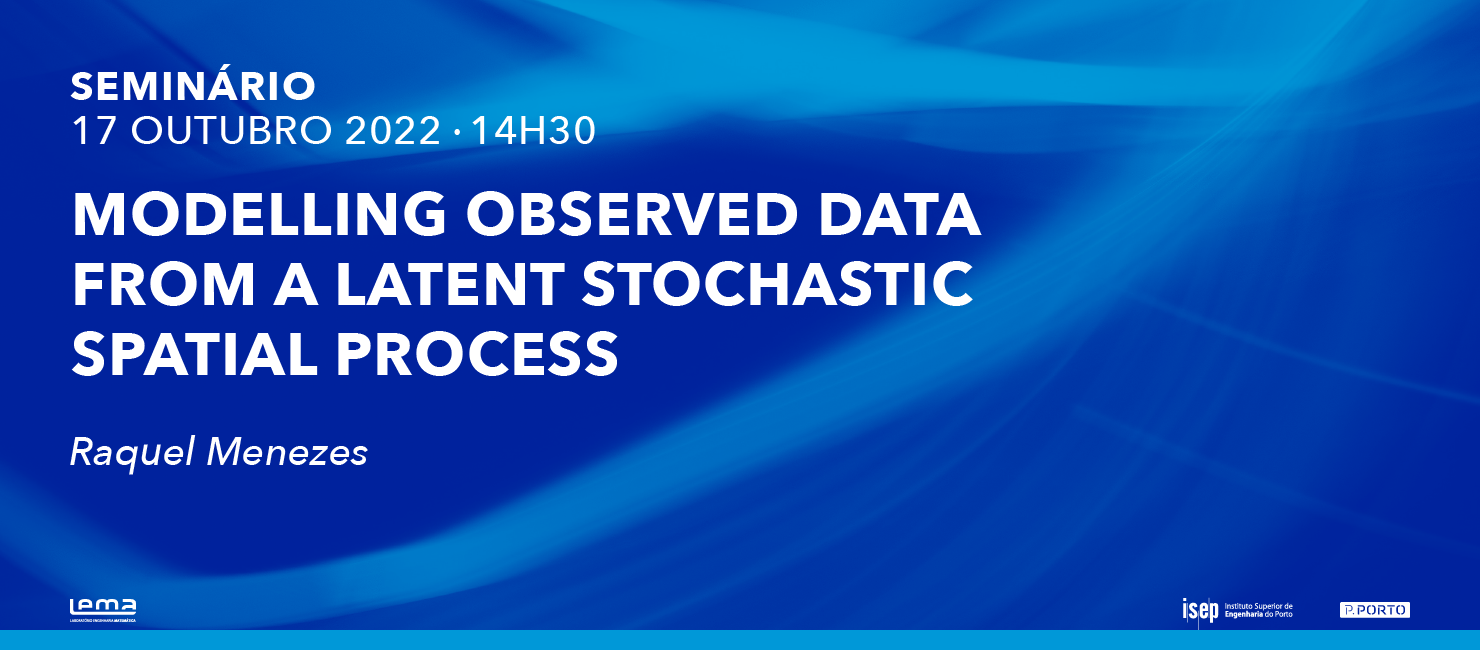Realiza-se, no próximo dia 17 de outubro, pelas 14h30, o seminário “Modelling Observed Data from a Latent Stochastic Spatial Process”, organizado pelo Laboratório de Engenharia Matemática (LEMA) do Instituto Superior de Engenharia do Porto (ISEP).