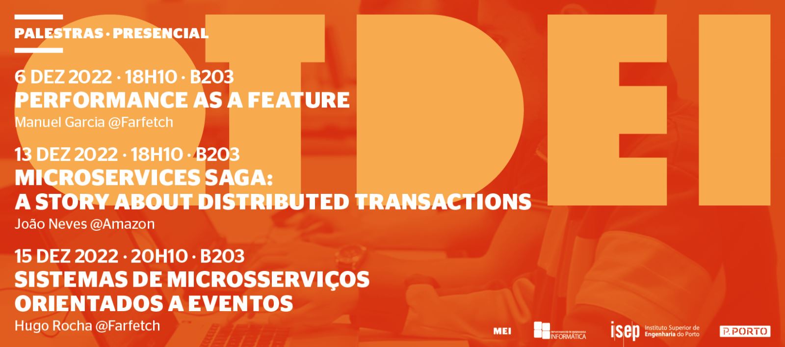 O Departamento de Engenharia Informática (DEI) do Instituto Superior de Engenharia do Porto (ISEP), numa iniciativa conjunta com o Mestrado em Engenharia Informática (MEI), convida à participação em três palestras, que terão lugar nos dias 6, 13 e 15 de dezembro.