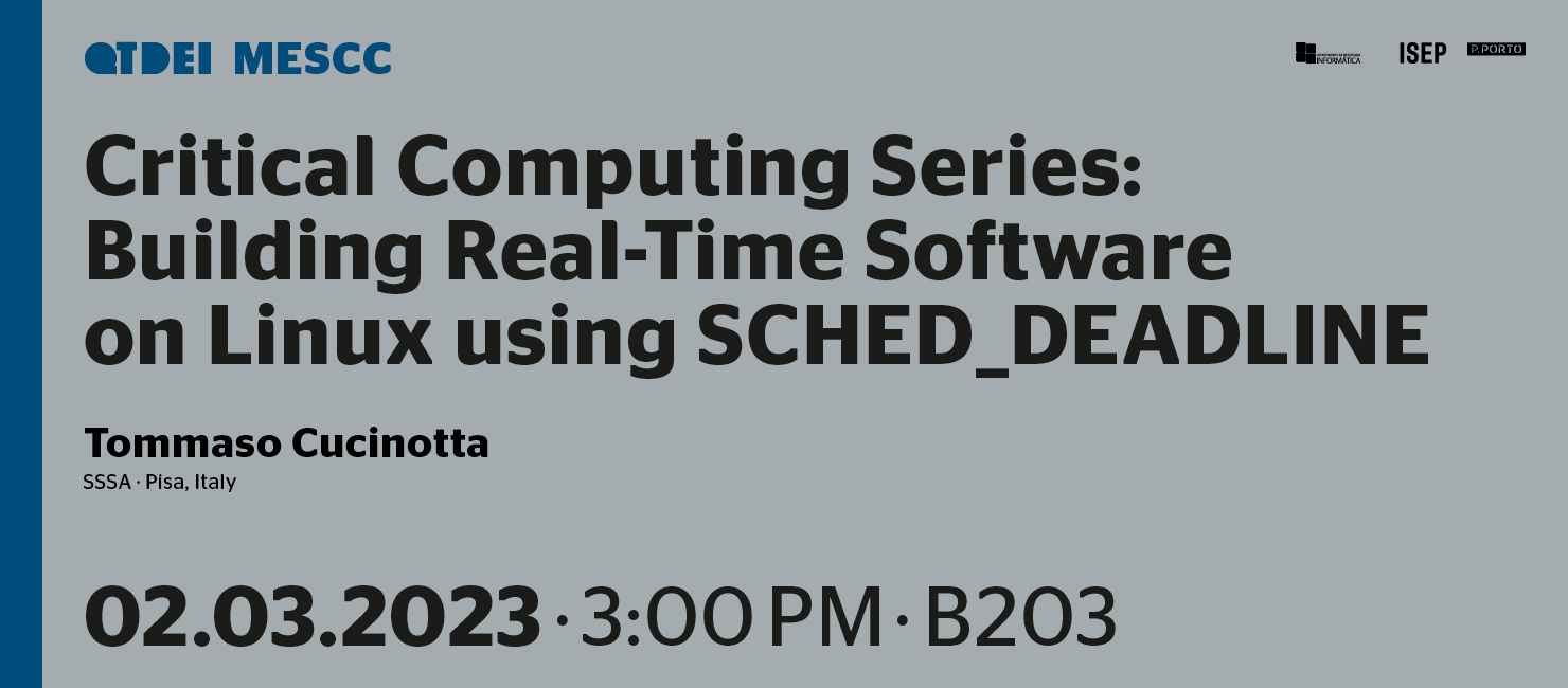 The Department of Informatics Engineering (DEI) of the Engineering Institute of Porto (ISEP), in collaboration with the Master in Critical Computing Systems Engineering (MESCC), invites to the webinar "Critical Computing Series: Building Real-Time Software on Linux using SCHED_DEADLINE", which will take place on March 2nd, at 3:00 PM, at ISEP.
