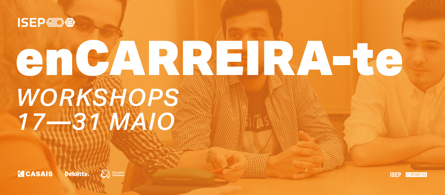 O ISEP|GO vai dinamizar, nas datas de 17, 22, 24, 29 e 31 de maio (de tarde), uma nova edição do ciclo de workshops enCARREIRA-te, no âmbito do desenvolvimento e conhecimento de competências e proporcionar uma integração plena no mercado de trabalho.