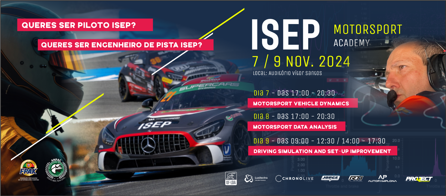 Entre os dias 7 e 9 de novembro, no Auditório Vítor Santos, localizado no edifício E, irá decorrer mais uma edição do ISEP Motorsport, seminário sobre competição automóvel, ministrado pelo engenheiro de pista Roberto Hernandez Garcia, reconhecido pela sua experiência internacional em diferentes campeonatos, como a Fórmula 1.