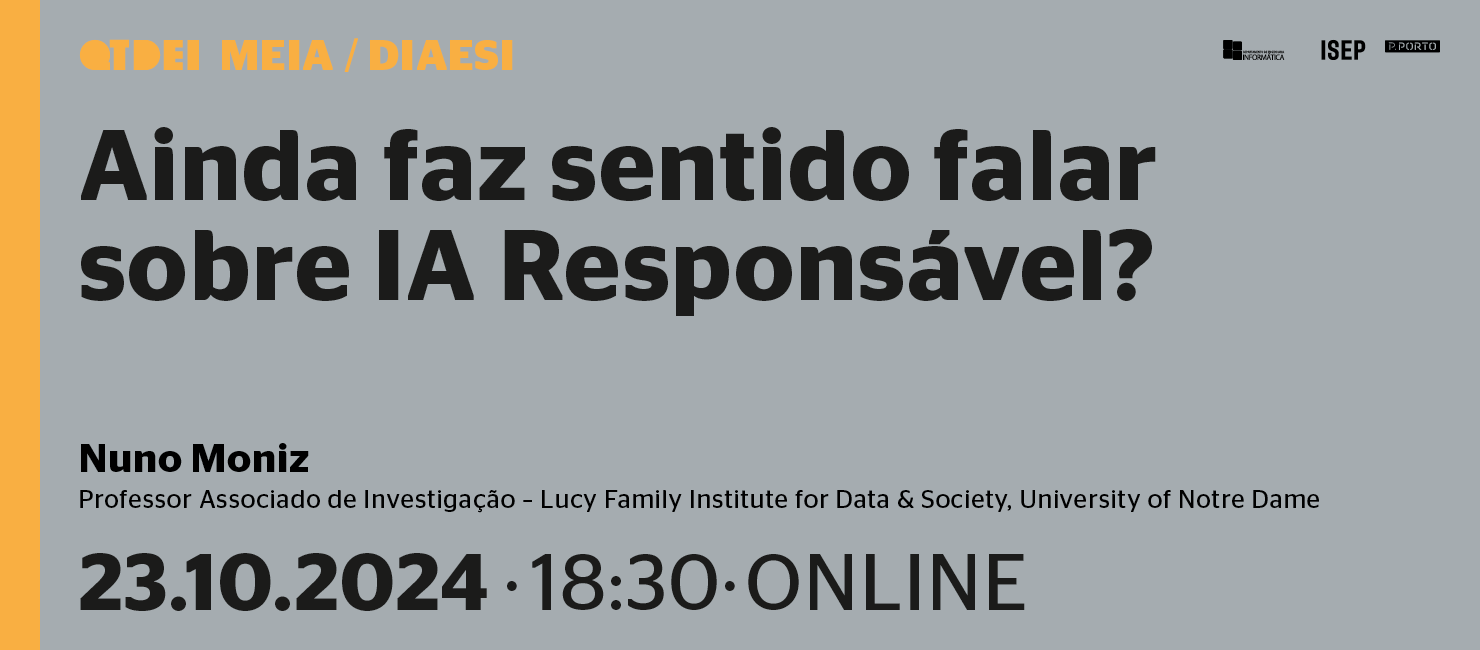 O Departamento de Engenharia Informática (DEI) do Instituto Superior de Engenharia do Porto (ISEP), numa iniciativa conjunta com o Mestrado em Engenharia de Inteligência Artificial (MEIA) e com o Doutoramento em IA e Engenharia de Sistemas Inteligentes (DIAESI), convida à participação em mais uma palestra, desta vez sobre o tema "Ainda faz sentido falar sobre IA Responsável?", que terá lugar no dia 23 de outubro, pelas 18h30.