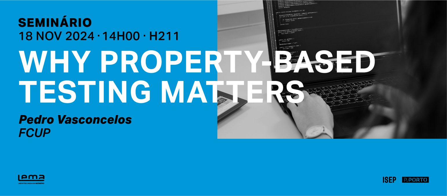 Realiza-se, no próximo dia 18 de novembro, pelas 14h, um seminário intitulado “Why Property-based Testing Matters”, promovido pelo Laboratório de Engenharia Matemática (LEMA) do Instituto Superior de Engenharia do Porto (ISEP).