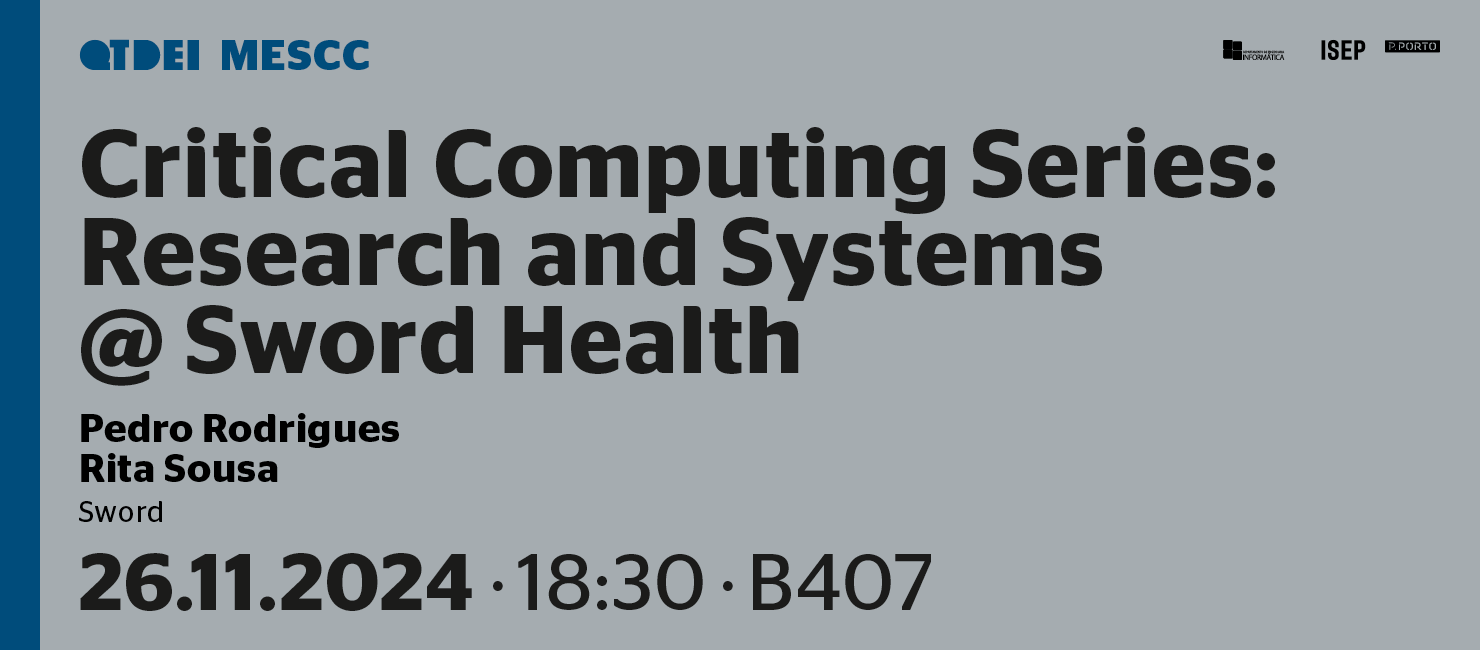 O Departamento de Engenharia Informática (DEI) do Instituto Superior de Engenharia do Porto (ISEP), numa iniciativa conjunta com o Mestrado em Engenharia de Sistemas Computacionais Críticos (MESCC), convida à participação no seminário “Critical Computing Series: Research and Systems @ Sword Health”, que terá lugar no dia 26 de novembro, às 18h30, na sala B407.