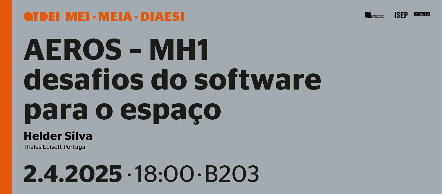 O Departamento de Engenharia Informática (DEI) do Instituto Superior de Engenharia do Porto (ISEP), numa iniciativa conjunta com o Mestrado em Engenharia Informática (MEI), com o Mestrado em Engenharia de Inteligência Artificial (MEIA) e com o Doutoramento em IA e Engenharia de Sistemas Inteligentes (DIAESI), convida à participação da palestra sobre o tema "AEROS – MH1 – desafios do software para o espaço", que terá lugar no dia 2 de abril, pelas 18h, na sala B203.