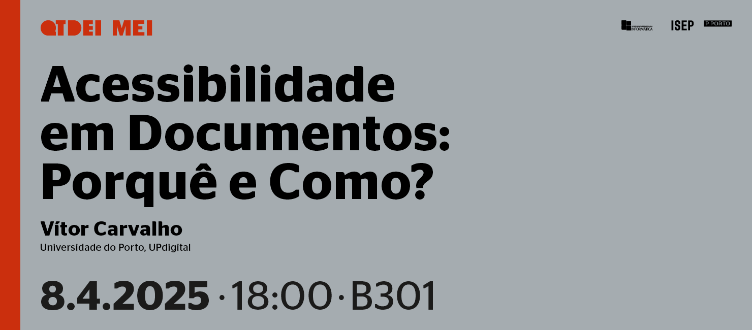 O Departamento de Engenharia Informática (DEI) do Instituto Superior de Engenharia do Porto (ISEP), numa iniciativa conjunta com o Mestrado em Engenharia Informática (MEI), convida à participação da palestra, com o tema “Acessibilidade em Documentos: Porquê e Como?”, que terá lugar no dia 8 de abril, pelas 18h, na sala B301.