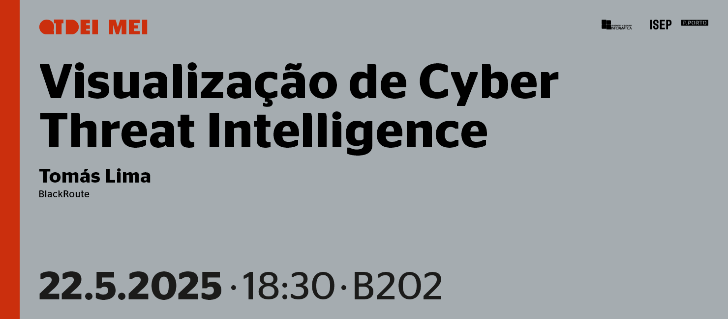 O Departamento de Engenharia Informática (DEI) do Instituto Superior de Engenharia do Porto (ISEP), numa iniciativa conjunta com o Mestrado em Engenharia Informática (MEI), convida à participação da palestra com o tema “Visualização de Cyber Threat Intelligence”, que terá lugar no dia 22 de maio, pelas 18h30, na sala B202.