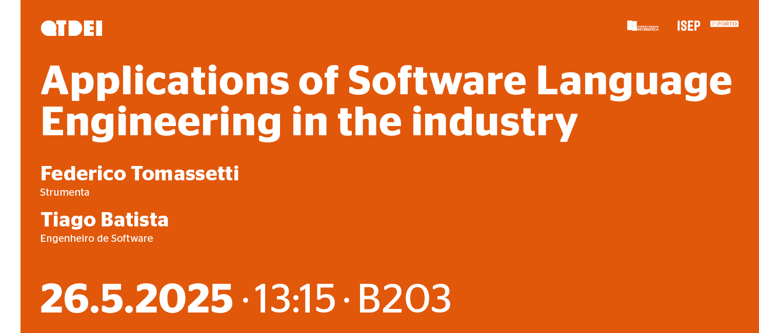 O Departamento de Engenharia Informática (DEI) do Instituto Superior de Engenharia do Porto (ISEP), convida à participação da Palestra, com o tema "Applications of Software Language Engineering in the industry", que terá lugar no dia 26 de maio, pelas 13h15, na sala B203. Esta sessão terá também transmissão online, que pode aceder aqui.