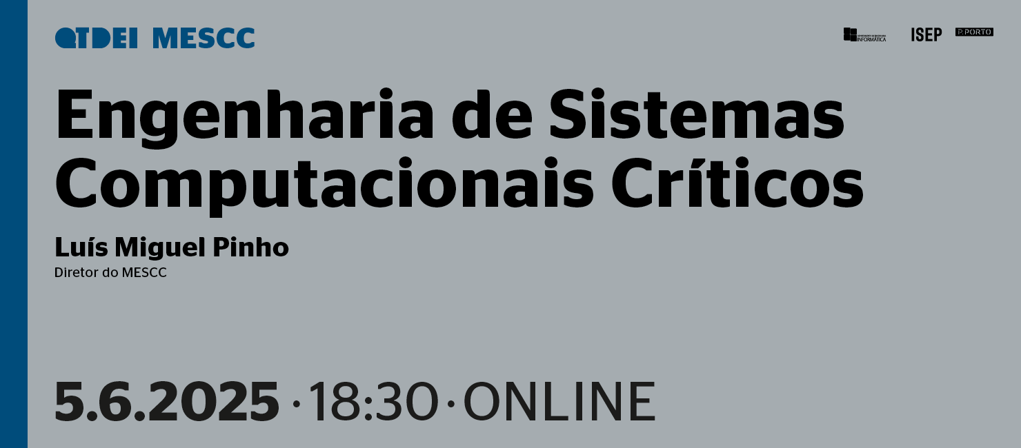 O Departamento de Engenharia Informática (DEI), do Instituto Superior de Engenharia do Porto (ISEP), numa iniciativa conjunta com o Mestrado em Engenharia de Sistemas Computacionais Críticos (MESCC), convida à participação no webinar "Engenharia de Sistemas Computacionais Críticos", que terá lugar no dia 5 de junho, às 18h30.
