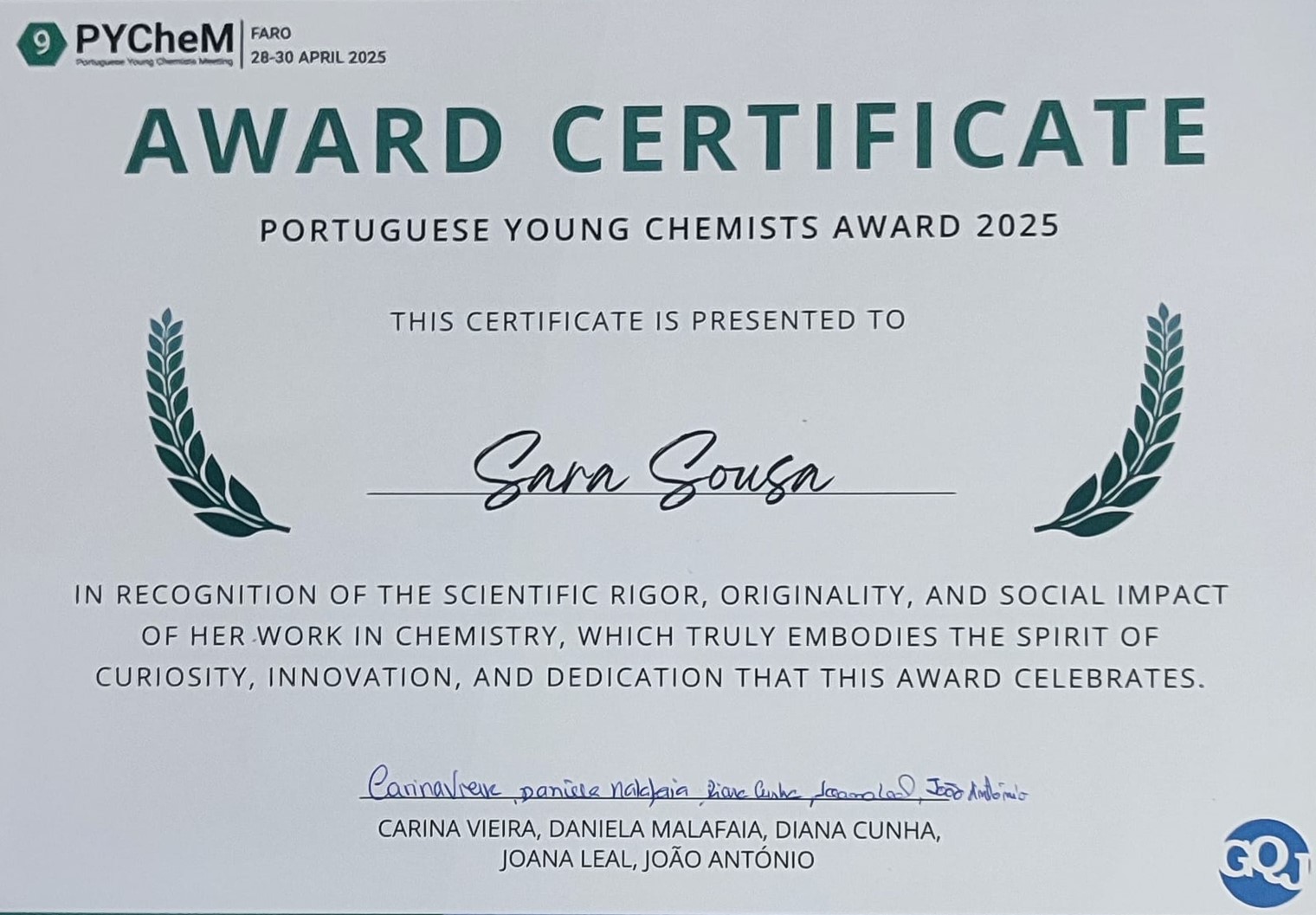 Atribuído bienalmente pela Sociedade Portuguesa de Química (SPQ), esta distinção visa promover a excelência em química desenvolvida por jovens investigadores, destacando projetos com impacto na sociedade. O prémio é atribuído a recém-doutorados com idade até 35 anos e distingue o trabalho desenvolvido durante o doutoramento.